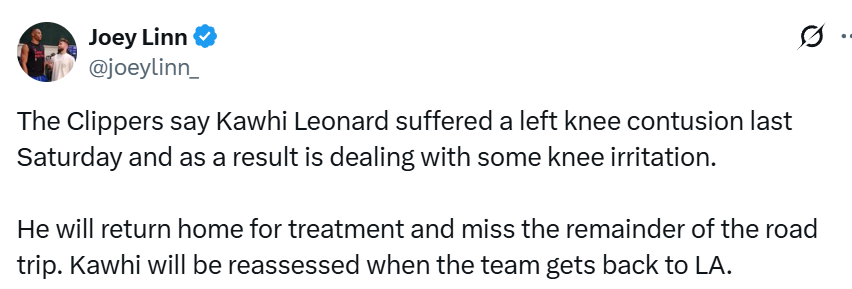 需要说明的是,此次出现不适的左膝,并非他此前多次接受手术治疗的那一侧膝盖。莱昂纳德曾因旧膝伤缺席了2024-25赛季的全部上半程比赛。