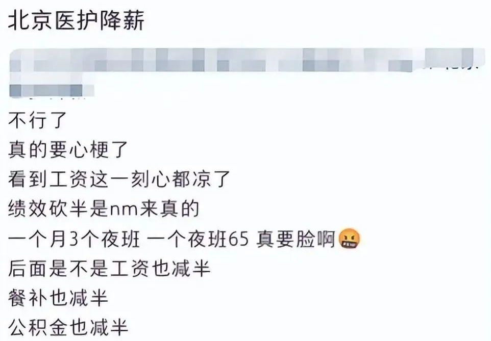 北京某医院日前也被爆出,夜班费从单次130元降至65元,普通夜班费从90元降至45元。