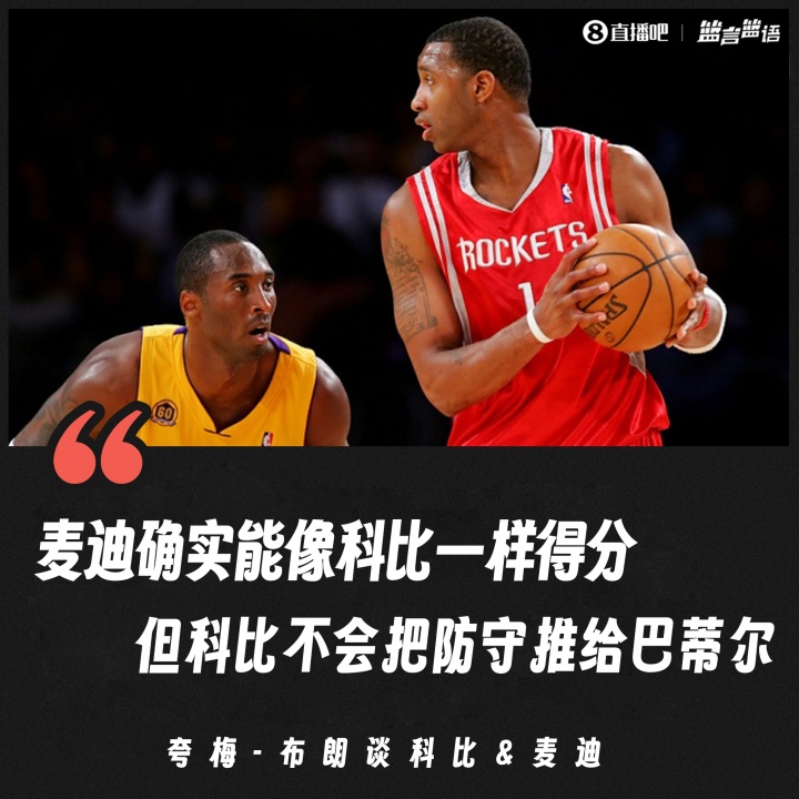 “麦迪始终逊色于科比。尽管他的得分能力与科比不相上下,数据看似耀眼,但真正让科比超越麦迪、并永远保持优势的,是科比根植于心的防守态度与防守能力。这正是科比能压制他的原因。当年每当二人被拿来比较,科比总是主动要求对位麦迪。真正的领袖渴望与强者交锋,乐于感受对手的能量。只要他们同场竞技,高下立判。”